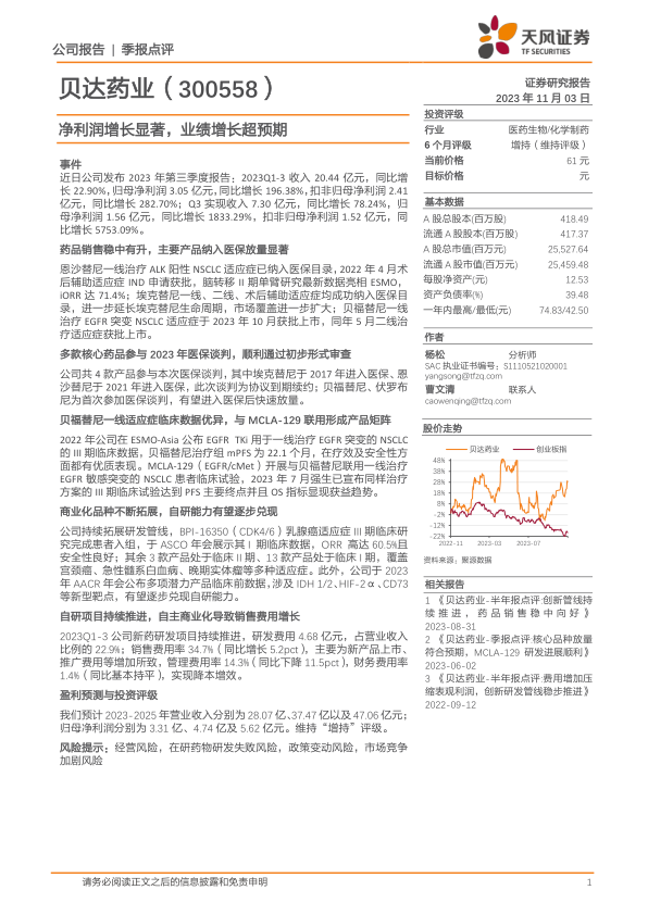 本报告对贝达药业2023年第三季度报告进行了深入分析,核心观点如下: