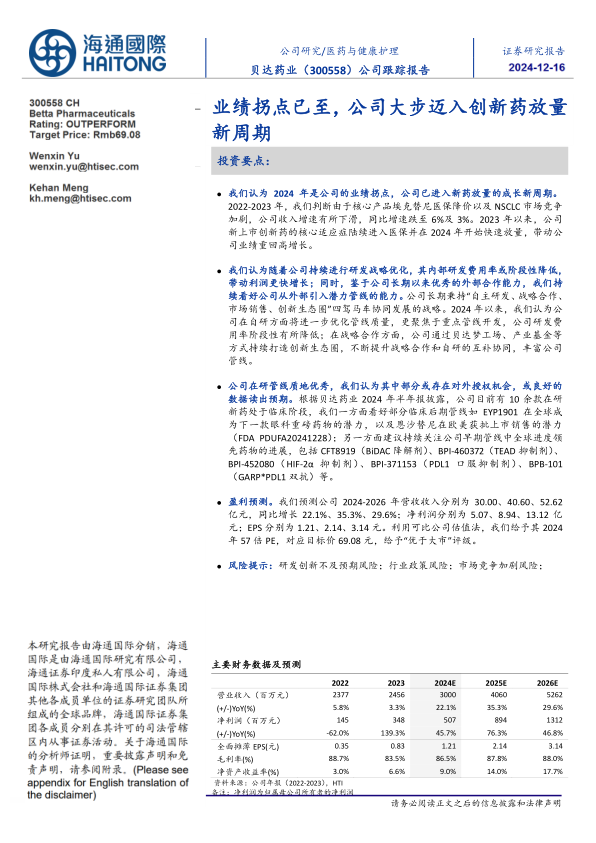 贝达药业正处于业绩增长的拐点,新药的上市和医保覆盖将推动公司进入新的增长周期。公司通过优化研发战略和积极开展外部合作,不断丰富产品管线,提升创新能力。在研管线质地优秀,具有良好的市场前景和潜在的对外授权机会。预计公司未来几年将保持较高的营收和利润增长,值得投资者关注。