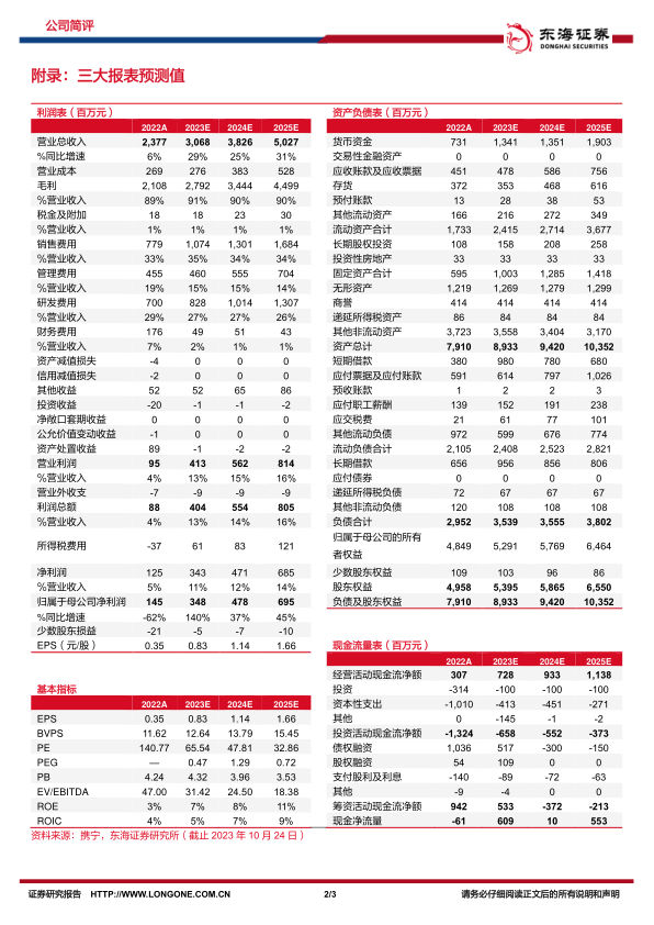 投资建议:我们预计公司2023-2025年实现营收30.68亿元、38.26亿元、50.27亿元,实现归母净利润3.48亿元、4.78亿元、6.95亿元,对应EPS分别为0.83/1.14/1.66元,对应PE分别为65.5倍/47.8倍/32.9倍。维持推荐,给予“买入”评级。