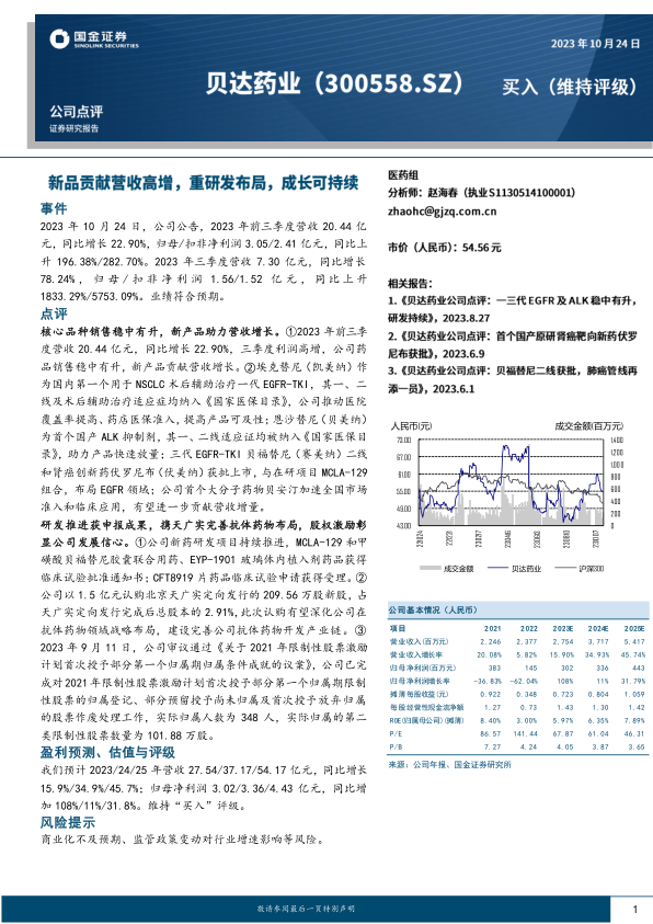 本报告分析了贝达药业2023年前三季度的业绩表现,指出公司营收和利润大幅增长,主要得益于核心品种销售的稳健增长以及新产品的成功上市和推广。
