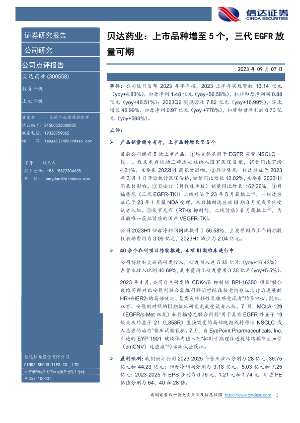 目前公司拥有5款上市产品:①埃克替尼用于EGFR突变NSCLC一线、二线及术后辅助三项适应症纳入国家医保目录,销量同比下滑4.21%,主要系2022H1高基数影响。②恩沙替尼一线适应症于2023年3月1日开始执行医保价格,销量同比增长12.02%,主要系2022H1高基数影响。③贝安汀(贝伐珠单抗)销量同比增长162.26%。④贝福替尼(三代EGFR-TKI)二线疗法于23年5月获批上市,一线适应症已于23年1月报NDA受理,术后辅助适应症III期3月完成首例受试者入组。⑤伏罗尼布(RTKs抑制剂,二线肾癌)6月获批上市,为目前唯一获批肾癌的国产VEGFR-TKI。