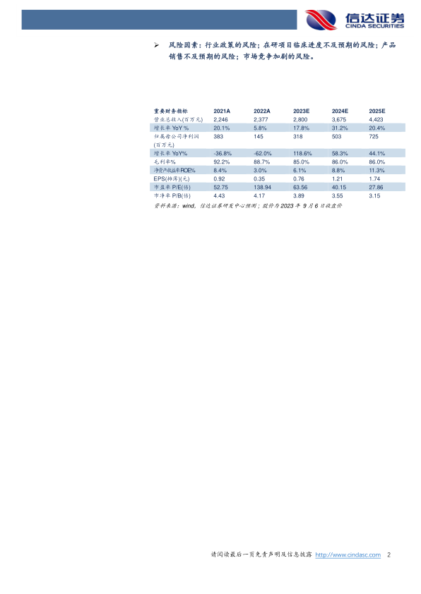 风险因素:行业政策的风险;在研项目临床进度不及预期的风险;产品销售不及预期的风险;市场竞争加剧的风险。