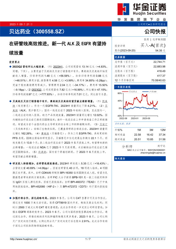 贝达药业2023年上半年业绩表现良好,营收和利润均实现增长。公司现有产品销售稳健,新产品上市有望贡献增量,在研管线高效推进,战略合作不断深化,为公司未来的发展奠定了坚实的基础。