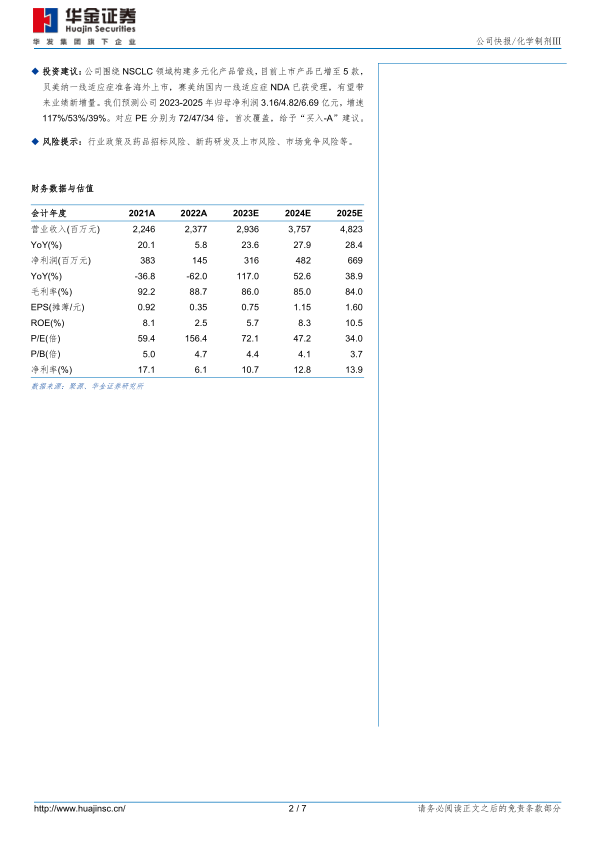投资建议:公司围绕NSCLC领域构建多元化产品管线,目前上市产品已增至5款,贝美纳一线适应症准备海外上市,赛美纳国内一线适应症NDA已获受理,有望带来业绩新增量。我们预测公司2023-2025年归母净利润3.16/4.82/6.69亿元,增速117%/53%/39%。对应PE分别为72/47/34倍,首次覆盖,给予“买入-A”建议。