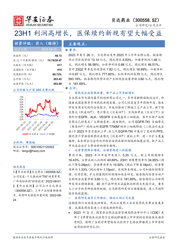 贝达药业2023年上半年业绩表现亮眼,利润实现高增长。公司凭借其在肺癌靶向治疗领域的深耕、新产品的上市以及运营管理效率的提升,展现出强劲的增长潜力。同时,医药政策的逐步完善,尤其是医保续约新规,有望为公司带来更多盈利空间。维持“买入”评级,但需关注审批准入、行业政策和销售等方面的风险。