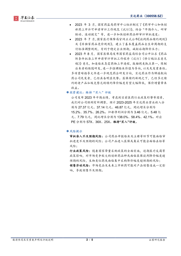公司发布2023年中期业绩,考虑到目前医药行业政策形势等因素,我们对公司预测有所调整,预计2023-2025年贝达药业营业收入分别为27.37亿元、37.14亿元、46.87亿元,同比增长分别为15.2%、35.7%、26.2%。归母净利润分别为3.46亿元、5.48亿元、7.79亿元,同比增长分别为138.0%、58.4%、42.1%。对应PE分别为57X、36X、25X。维持“买入”评级。