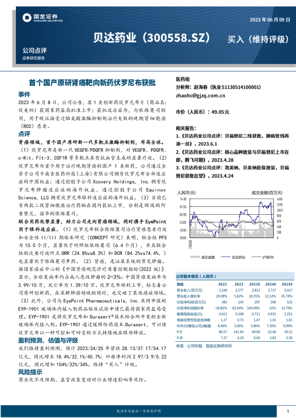本报告分析了贝达药业1类创新药伏罗尼布片获批上市的事件,认为该药物作为首个国产原研新一代多靶点激酶抑制剂,在肾癌治疗领域具有重要意义。伏罗尼布联合依维莫司的治疗方案在临床研究中表现出显著优势,为晚期肾细胞癌患者提供了新的治疗选择。同时,公司积极拓展伏罗尼布在眼科领域的应用,有望进一步提升其市场价值。维持对公司盈利预测和“买入”评级,但需关注商业化不及预期等风险。