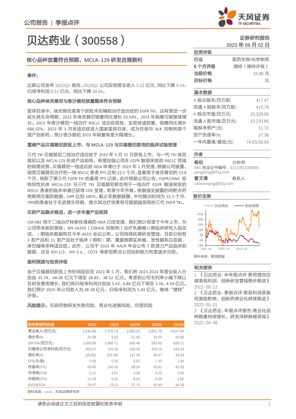 由于贝福替尼获批上市时间延后至2023年5月,我们将2023-2024年营业收入分别由35.74、48.68亿元下调至28.85、38.52亿元。考虑到公司毛利率小幅下降以及研发费用增长,我们将归母净利润分别由5.43、6.88亿元下调至3.36、4.59亿元。我们预计2025年公司收入为48.38亿元,归母净利润为5.43亿元,维持“增持”评级。