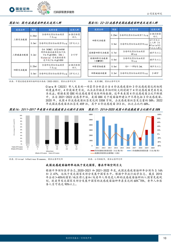 核心产品先发优势显著,奠定流感疫苗行业龙头地位。 公司拥有我国目前规模最大的流感疫苗生产基地,在流感疫苗的研发、生产和销售领域占据领先地位。公司于 2018 年国内首家上市四价流感病毒裂解疫苗,并于 2022 年国内首家上市四价流感疫苗(儿童剂型),先发优势显著。 2018-2020 年公司四价流感疫苗批签发数量分别为 512.2 万剂、 836.1 万剂和 2062.4 万剂,均居国内首位;2021-2022 年公司流感疫苗分别取得批签发 100 批及 103 批,其中四价流感疫苗分别为 96 批及 91 批(包含儿童剂型 14 批),四价流感疫苗及流感疫苗批签发批次数量均继续保持国内领先地位。流感疫苗接种率提升空间较大,市场培育+政策引导有望持续推动渗透率提升。 接种流感疫苗是预防流感有效且经济的手段。根据中华预防医学杂志,当前我国流感疫苗整体接种率约 3%,远低于发达国家及部分发展中国家接种率水平,提升空间较大。从政策面看,参考韩国等国家经验,免费接种等政策可有力推动流感疫苗接种率提升,近年来我国流感疫苗接种政策覆盖人群持续扩大,2021-2022 年度免费接种政策覆盖人群已超过 2000 万人。从供给端看, 2022 年国内流感疫苗获批签发企业数量已达 10 家,未来随着供应企业数量进一步增加,以及流感疫苗市场教育的进一步推动,流感疫苗接种率有望持续提升。