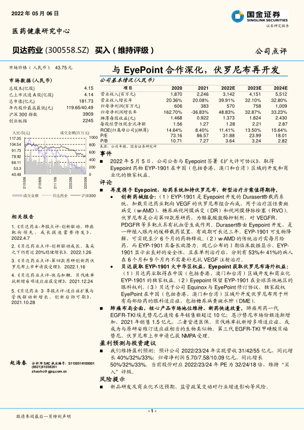 贝达获取EYP-1901大中华区权益,Eyepoint获取伏罗尼布海外权益: