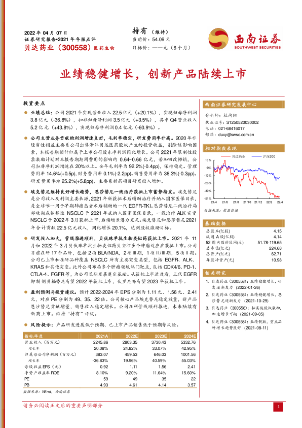贝达药业2021年业绩稳健增长,核心产品埃克替尼保持良好增长势头,恩莎替尼市场潜力巨大。公司持续加大研发投入,管线推进顺利,贝伐珠单抗生物类似药获批上市,为公司长期发展奠定基础。维持“持有”评级,但需关注产品研发和销售风险。