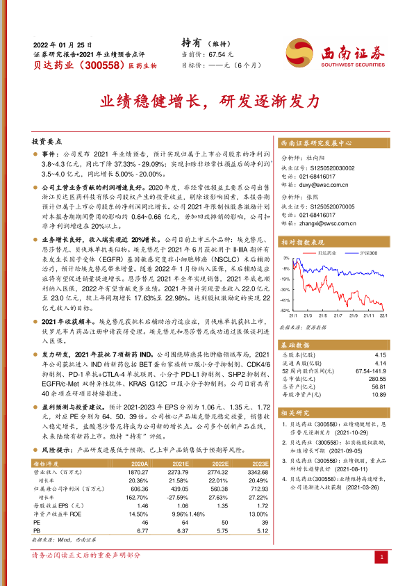 贝达药业2021年业绩预告显示公司业绩稳健增长,主营业务贡献的利润增速良好。埃克替尼和恩莎替尼纳入医保,有望促进销量增长。公司加大研发投入,创新药管线丰富,未来有望陆续有新药上市。维持“持有”评级,但需注意产品研发和销售低于预期的风险。