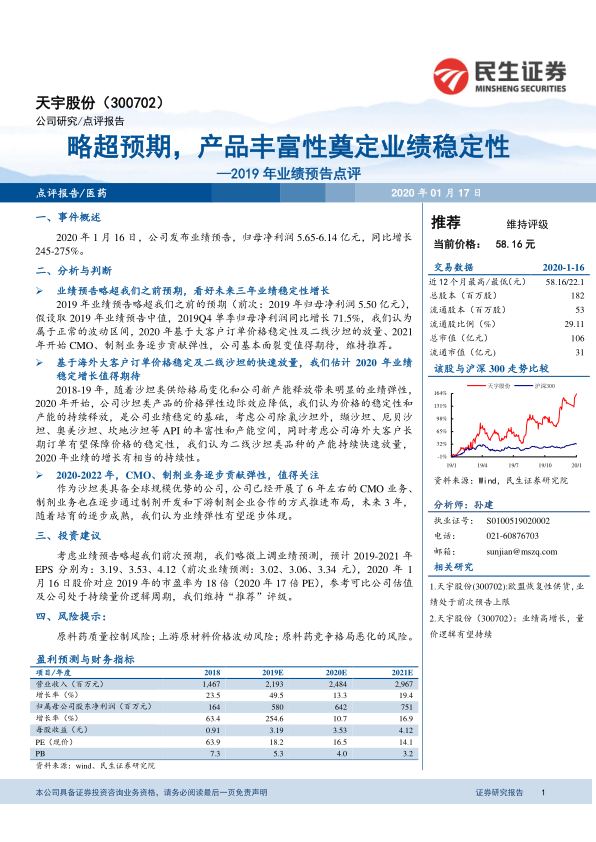 本报告对天宇股份2019年业绩预告进行了点评,认为公司业绩略超预期,主要受益于大客户订单稳定和二线沙坦放量。预计未来三年,公司业绩将保持稳定增长,CMO和制剂业务将逐步贡献弹性。维持“推荐”评级,但需关注原料药质量控制、原材料价格波动和竞争格局恶化等风险。