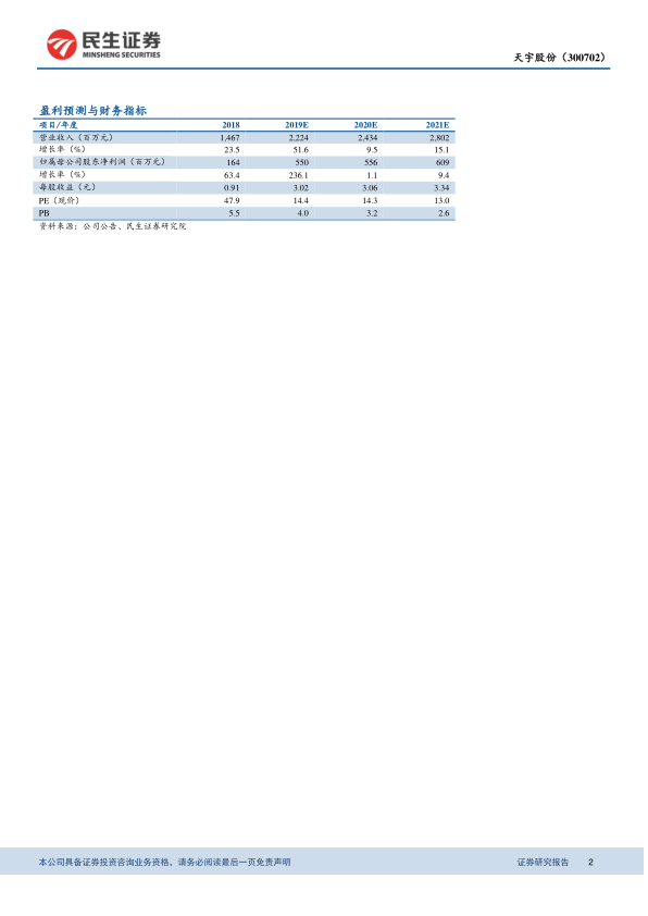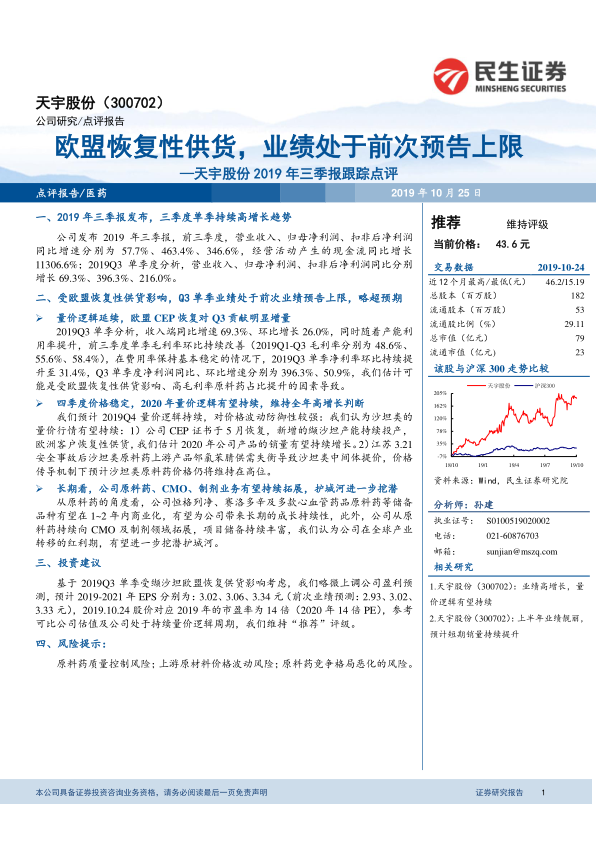 天宇股份2019年三季报业绩表现亮眼,主要受益于欧盟恢复供货带来的量价齐升。公司在原料药、CMO和制剂业务方面的积极拓展,有望进一步增强其长期竞争力。维持“推荐”评级,但需关注原料药质量控制、原材料价格波动以及市场竞争格局等风险。