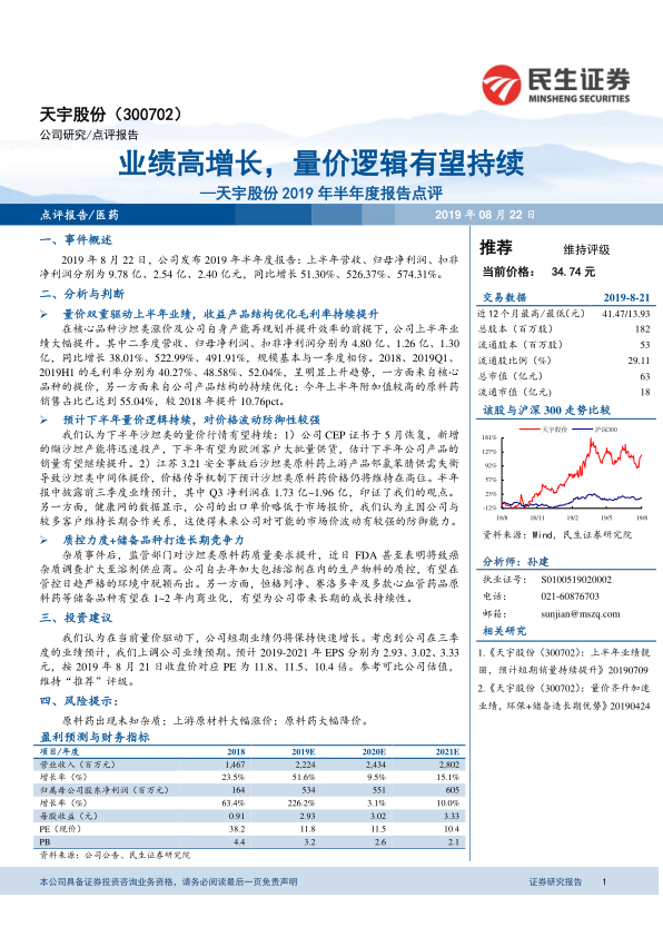 天宇股份2019年上半年业绩表现亮眼,营收和净利润均实现大幅增长,主要得益于沙坦类核心产品的量价齐升以及产品结构优化带来的毛利率提升。展望下半年,随着CEP证书的恢复和上游供需紧张,沙坦类产品的量价逻辑有望持续,公司通过长期合作关系也具备较强的价格波动防御能力。此外,公司在质量控制方面的投入和丰富的储备品种将为其构建长期竞争力。基于对公司未来业绩的积极预期,分析师维持“推荐”评级,但同时提示了原料药杂质、原材料价格波动和产品降价等潜在风险。