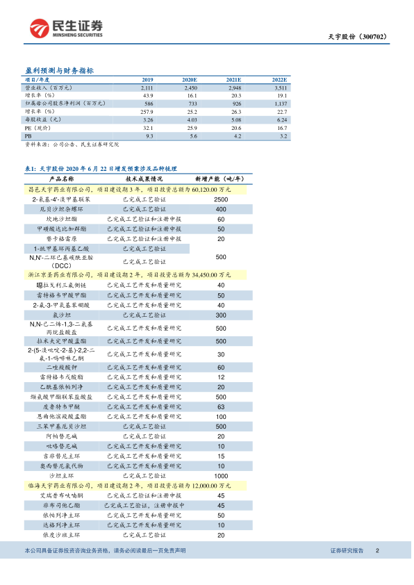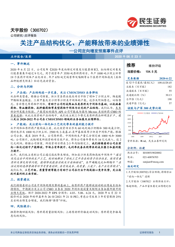 本报告分析了天宇股份的定向增发预案,指出公司通过优化产品结构,拓展CMO/CDMO业务,并进行前向一体化和工艺优化,有望提升盈利能力。维持“推荐”评级,但同时也提示了相关风险。