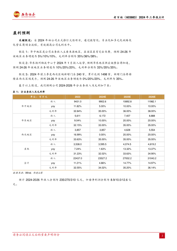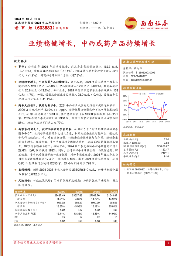 本报告对老百姓(603883)2024年三季报进行了深度分析,核心观点如下: