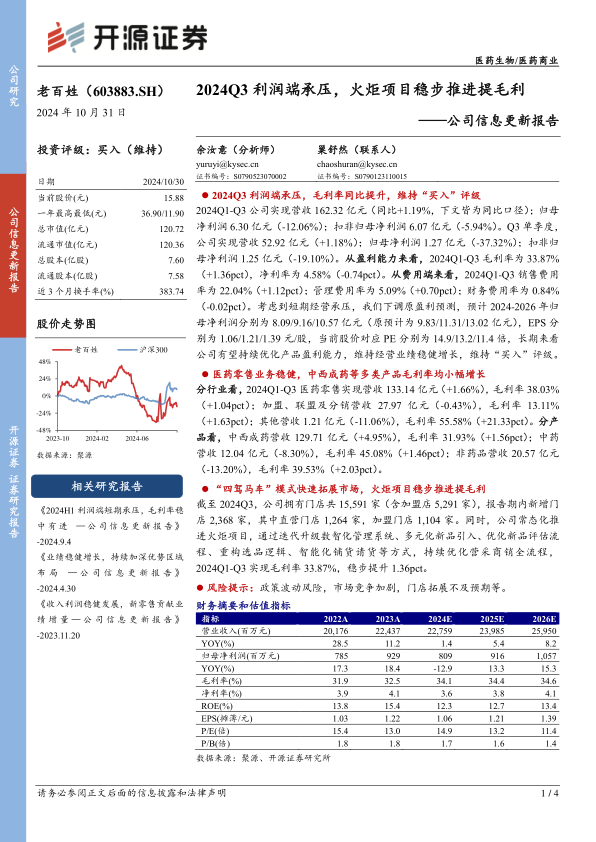 2024年第一至第三季度,老百姓实现营收162.32亿元,同比增长1.19%;归母净利润6.30亿元,同比下降12.06%;扣非归母净利润6.07亿元,同比下降5.94%。其中,第三季度单季营收52.92亿元,同比增长1.18%;归母净利润1.27亿元,同比大幅下降37.32%;扣非归母净利润1.25亿元,同比下降19.10%。从盈利能力看,2024Q1-Q3毛利率为33.87%,同比提升1.36个百分点;净利率为4.58%,同比下降0.74个百分点。费用端,销售费用率22.04%(+1.12pct),管理费用率5.09%(+0.70pct),财务费用率0.84%(-0.02pct)。考虑到短期经营压力,分析师下调了2024-2026年归母净利润预测至8.09/9.16/10.57亿元,对应EPS分别为1.06/1.21/1.39元/股,但仍维持“买入”评级,看好公司长期盈利优化和稳健增长。