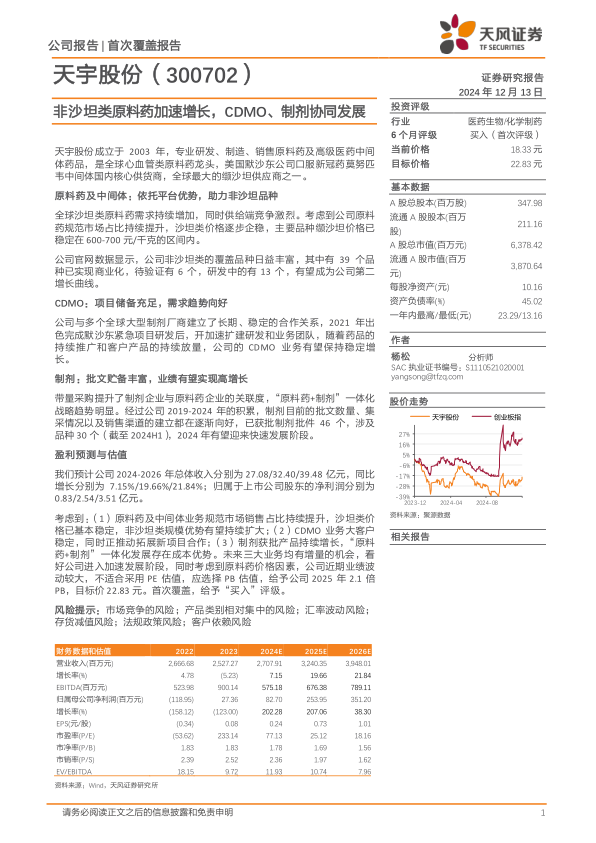 天宇股份凭借其国际化的质量认证体系和与全球大型制剂厂商的长期合作关系,在全球医药市场中占据稳固地位。尽管近期业绩受到市场竞争和特定业务需求波动的影响,但公司通过持续的技术改造、产品结构优化和市场拓展,已成功扭转亏损并重回增长通道。报告分析指出,沙坦类原料药价格已趋于稳定,非沙坦类业务的放量以及CDMO和制剂业务的协同效应,将共同驱动公司未来业绩进入加速发展阶段。基于对公司三大核心业务增长潜力的综合评估,报告首次覆盖并给予“买入”评级。