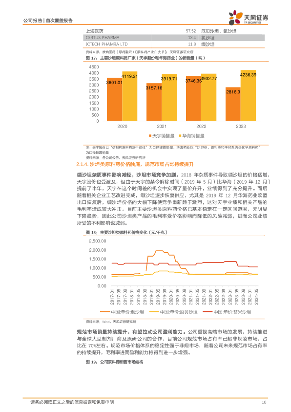 全球沙坦类原料药需求持续增加,同时供给端竞争激烈。考虑到公司原料药规范市场占比持续提升,沙坦类价格逐步企稳,主要品种缬沙坦价格已稳定在600-700元/千克的区间内。