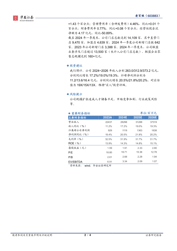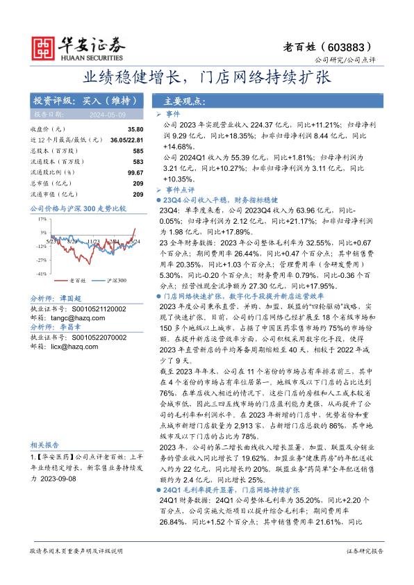 本报告对老百姓大药房(603883)2023年业绩及2024年一季度表现进行了分析,并维持“买入”的投资评级。