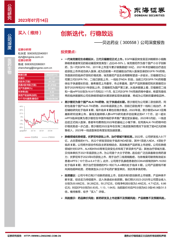 投资建议: 公司今年已有2个创新药获批上市,目前共有5款创新药上市销售,产品种类不断丰富,综合实力持续提升,迈入快速成长收获期。我们预计2023-2025年公司营业收入分别为30.68亿元、 38.26亿元、 50.27亿元,归母净利润分别为3.48亿元、 4.71亿元、 6.86亿元;对应EPS分别为0.83元、 1.13、 1.64元;当前股价对应PE分别为62.0倍/45.9倍/31.5倍。维持推荐,给予“买入”评级。