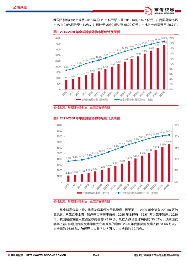 全球癌症发病率持续上升,预计2030年全球新发癌症患者将达到2411万人,中国新发患者预计增至570万人。伴随癌症发病率的增长和药物创新,全球抗肿瘤药物市场规模从2015年的832亿美元增长至2019年的1435亿美元,预计2030年将达到3913亿美元。中国抗肿瘤药物市场也从2015年的1102亿元增长至2019年的1827亿元,预计2030年将达到6620亿元。肺癌在全球和中国均是发病率和死亡率最高的癌种,2020年全球肺癌发病人数220.68万,死亡人数179.61万;中国肺癌发病人数81.56万,死亡人数71.47万。