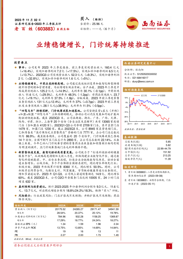 老百姓(603883)发布2023年三季报,业绩稳健增长,主要得益于高效的组织变革和数智化转型。公司坚持“四驾马车”模式深耕市场,门店数量持续扩张。门诊统筹政策的加速落地显著提升了门店的来客数和销售额。同时,公司积极推进数智化转型,线上渠道销售额大幅增长。预计未来几年公司归母净利润将保持稳定增长,维持“买入”评级,但需关注行业政策、门店扩张、并购以及药品降价等风险。