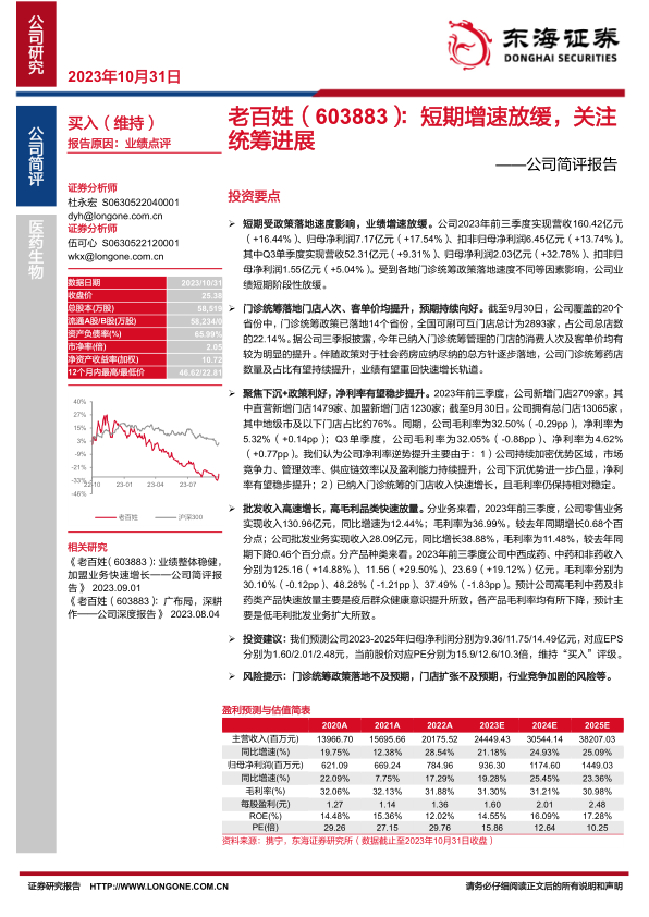 老百姓公司在2023年前三季度业绩增速短期放缓,主要受门诊统筹政策落地速度差异影响。然而,随着门诊统筹政策的逐步实施,已纳入门店的客流和客单价均显著提升,为公司未来业绩增长奠定基础。公司通过聚焦下沉市场进行门店扩张,并优化业务结构,推动高毛利品类快速增长,有效提升了净利率。分析师维持“买入”评级,并预计公司未来几年将实现稳健的盈利增长,但需关注政策落地、门店扩张及市场竞争等潜在风险。