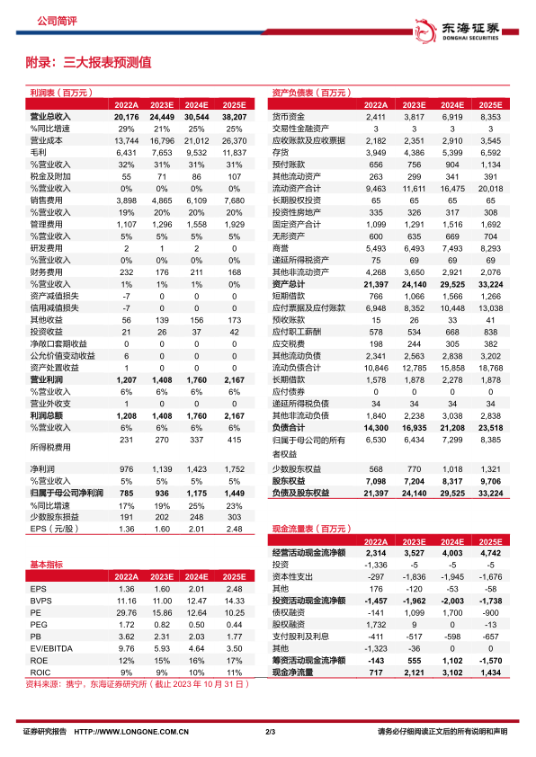 投资建议:我们预测公司2023-2025年归母净利润分别为9.36/11.75/14.49亿元,对应EPS分别为1.60/2.01/2.48元,当前股价对应PE分别为15.9/12.6/10.3倍,维持“买入”评级。