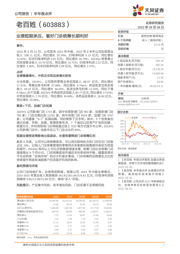 老百姓2023年上半年业绩稳健增长,尤其在医药零售和批发业务方面表现突出。公司积极拓展门店,并聚焦下沉市场,为未来增长奠定基础。短期业绩虽受政策影响有所波动,但长期来看,门诊统筹政策的推进将为公司带来更多发展机遇。天风证券维持对公司“买入”评级,并提示投资者关注相关风险。