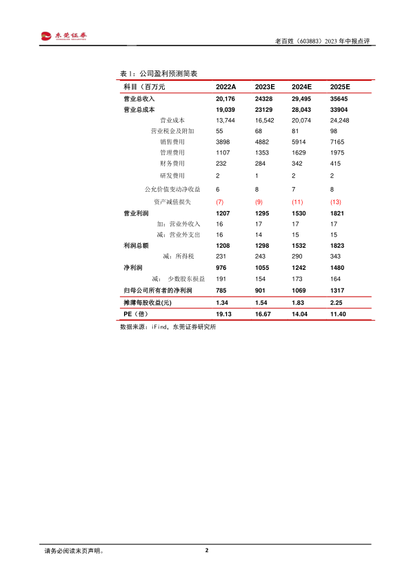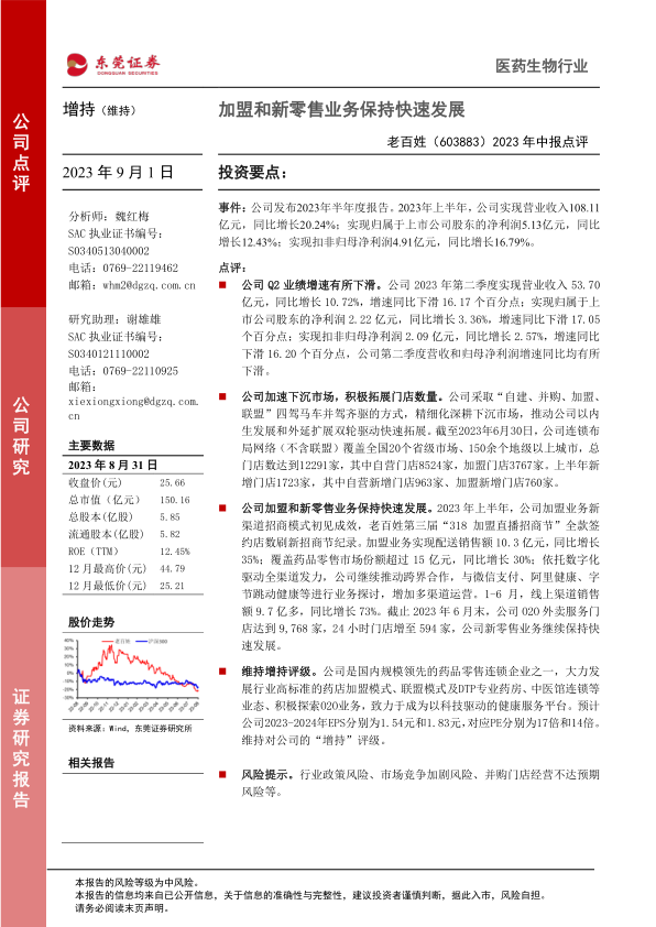 老百姓2023年中报显示,公司营收保持增长,但Q2增速放缓。公司通过加速下沉市场,拓展门店数量,尤其是加盟和新零售业务的快速发展,成为业绩增长的重要驱动力。东莞证券维持对公司的“增持”评级,看好公司未来的发展潜力,但也提示了行业政策、市场竞争和并购风险。