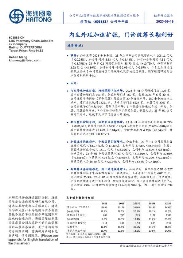 老百姓药房2023年上半年业绩表现稳健,通过内生外延加速扩张,持续深耕下沉市场,运营能力保持稳健,费用控制良好。新零售业务持续推进,线上渠道快速增长。预计公司未来几年净利润将保持快速增长,维持“优于大市”评级。但同时也需关注医保政策收紧、门店管理和扩张等风险。
