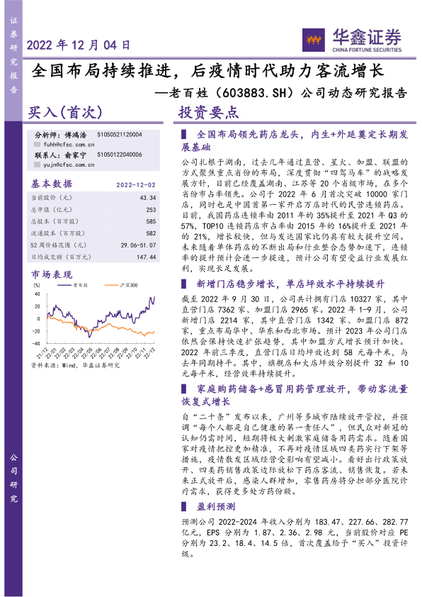老百姓大药房凭借其领先的全国布局、突破万店的规模优势以及持续提升的单店运营效率,在行业整合加速的背景下展现出强劲的增长潜力。随着后疫情时代政策的优化,家庭购药需求和感冒用药管理放开将有效刺激客流和销售恢复,并有望承接部分医疗需求。报告预测公司未来三年营收和净利润将保持稳健增长,并首次给予“买入”评级,但投资者需关注疫情政策、门店扩张及新店盈利等潜在风险。