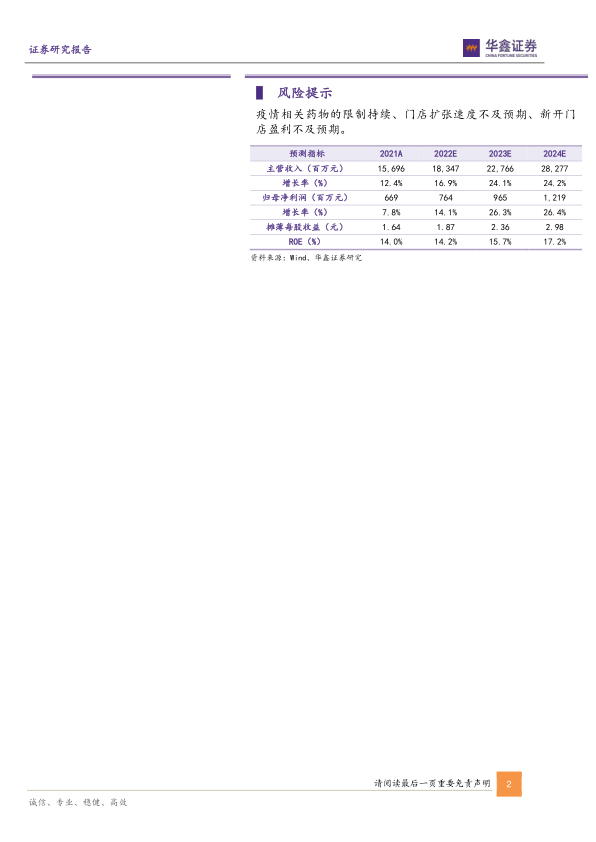 报告提示的主要风险包括:疫情相关药物的限制持续、门店扩张速度不及预期、新开门店盈利不及预期。