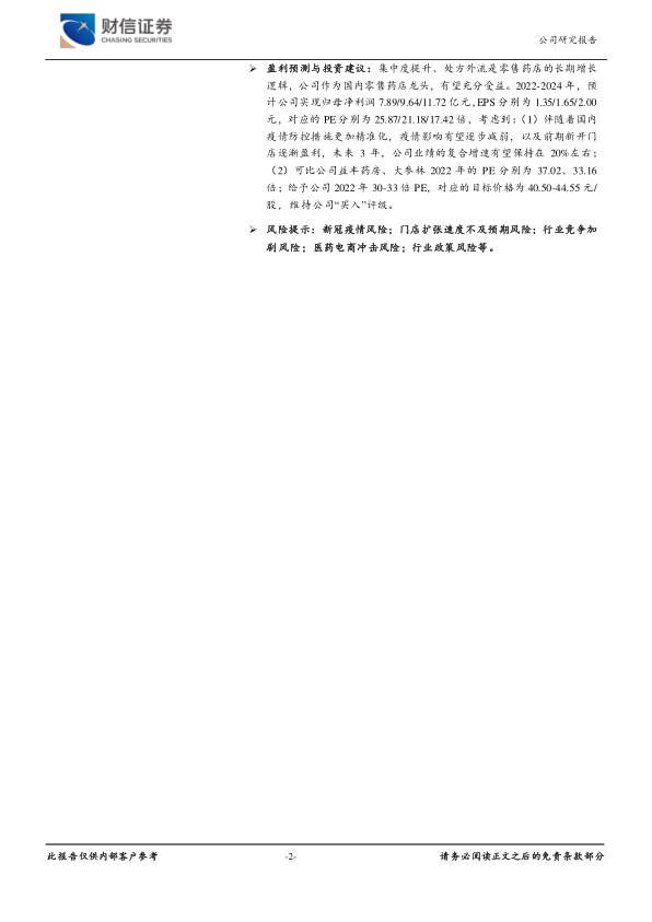 风险提示:新冠疫情风险;门店扩张速度不及预期风险;行业竞争加剧风险;医药电商冲击风险;行业政策风险等。
