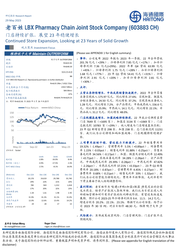 盈利预测:老百姓作为“自建+并购+加盟+联盟”特色突出的全国龙头药店,轻资产扩张深入各级市场,我们认为目前正进入内部精细管理和对外有序扩张的红利释放阶段,有望迎来快速发展期。预计公司2023-25年归母净利润为9.4、11.5、14.2亿元,增速分别为20.2%、22.1%、23.1%,根据可比公司估值,给予公司2023年30倍PE,对应目标价48.30元,维持“优于大市”评级。