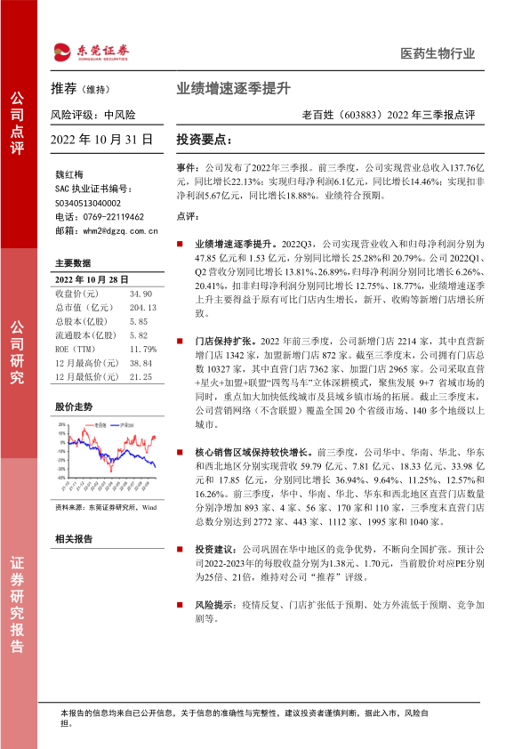 老百姓2022年三季报显示业绩符合预期,营收和利润均实现稳健增长,主要受益于内生增长和门店扩张。公司通过多种模式深耕市场,巩固优势区域并积极拓展下沉市场,营销网络不断扩大。维持“推荐”评级,但需关注疫情、扩张速度、处方外流以及市场竞争等风险因素。