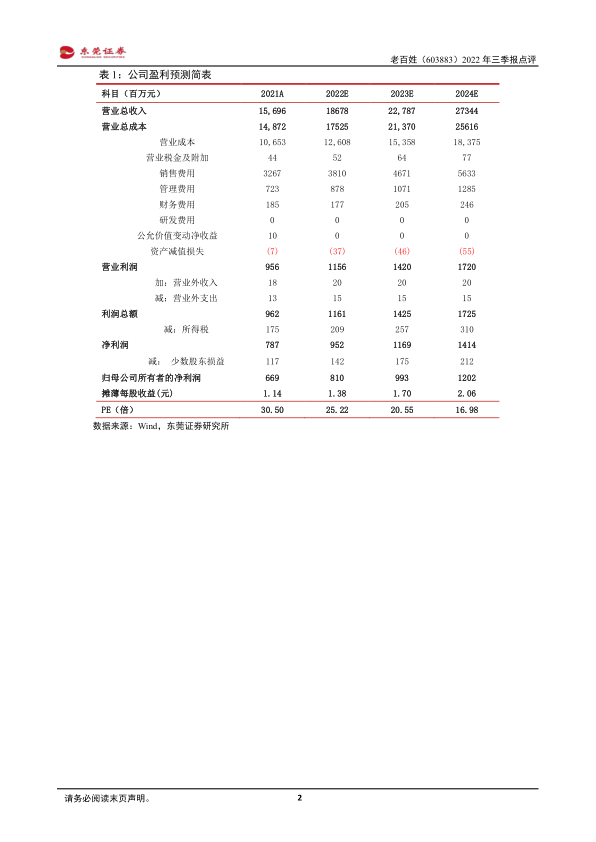 投资建议:公司巩固在华中地区的竞争优势,不断向全国扩张。预计公司2022-2023年的每股收益分别为1.38元、1.70元,当前股价对应PE分别为25倍、21倍,维持对公司“推荐”评级。