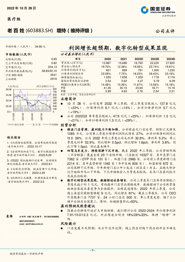 本报告全面分析了公司在2022年前三季度的强劲业绩表现,指出其利润增长超预期,并强调了数字化转型成果的显现。公司通过精益化门店管理、持续深耕下沉市场以及数据驱动的新零售业务,实现了营收和利润的双重增长。财务数据显示,公司盈利能力稳步提升,未来业绩增长确定性较高。尽管面临门店扩张、处方外流和线上竞争等风险,但公司凭借其清晰的战略布局和有效的运营策略,有望继续保持增长态势,因此维持“增持”评级。