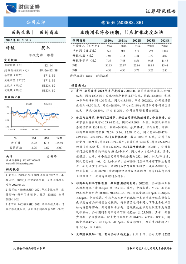 老百姓公司在2022年上半年展现出强劲的经营韧性和增长潜力,营业收入和归母净利润均实现两位数增长,符合市场预期。公司通过“老店内生增长”与“新增门店增多”的双轮驱动策略,成功将门店总数拓展至万家以上,尤其加盟门店的快速扩张有效提升了市场覆盖率。尽管非药品毛利率因产品结构调整有所下降,但中西成药和中药毛利率的提升以及期间费用率的有效控制,使得公司整体盈利能力保持稳定。此外,公司推出的股权激励计划将进一步激发核心团队的积极性,为未来三年的业绩增长目标提供有力保障。展望未来,作为零售药店行业的领军企业,老百姓有望持续受益于行业集中度提升和处方外流的长期趋势,预计未来三年业绩将保持约20%的复合增速。财信证券维持其“买入”评级,并设定了35.25-42.30元/股的目标价格。