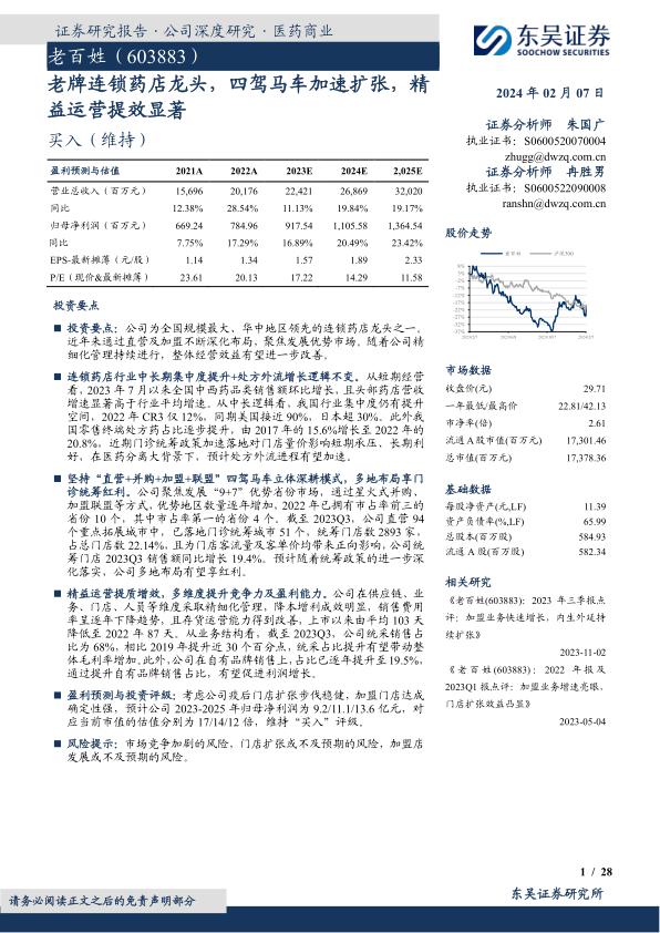 老百姓大药房作为中国领先的连锁药店龙头,凭借其“直营+并购+加盟+联盟”的“四驾马车”立体深耕模式,实现了门店网络的持续扩张和市场份额的稳步提升。公司在华中、华东等优势区域市场表现突出,并通过精益化运营,在供应链管理、自有品牌建设和数字化转型方面取得了显著成效,有效提升了盈利能力。面对行业集中度提升和处方外流加速的有利趋势,特别是门诊统筹政策的落地,公司凭借其广泛的统筹门店布局和高效的运营管理,有望充分受益。尽管短期内可能面临高基数压力,但预计2024年将恢复高速增长。综合来看,公司具备稳固的龙头地位、清晰的增长战略和良好的盈利前景,当前估值具备吸引力,维持“买入”评级。