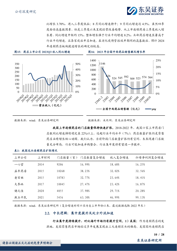 连锁药店行业中长期集中度提升+处方外流增长逻辑不变。从短期经营看,2023年7月以来全国中西药品类销售额环比增长,且头部药店营收增速显著高于行业平均增速。从中长逻辑看,我国行业集中度仍有提升空间,2022年CR3仅12%,同期美国接近90%,日本超30%。此外我国零售终端处方药占比逐步提升,由2017年的15.6%增长至2022年的20.8%,近期门诊统筹政策加速落地对门店量价影响短期承压、长期利好,在医药分离大背景下,预计处方外流进程有望加速。