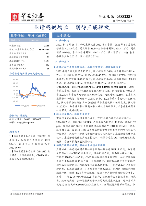 和元生物在2022年前三季度展现出稳健的经营态势,尽管受到疫情影响,但营收和扣非归母净利润仍实现显著增长。公司持续加大研发投入,巩固了在基因治疗CRO和CDMO领域的技术领先优势。同时,临港新产能的建设和即将释放,预示着公司未来业绩将迎来高速增长。华安证券维持“增持”评级,并预计公司在2022-2024年将保持高成长性,但投资者需关注疫情、监管、下游研发及产能扩建等潜在风险。