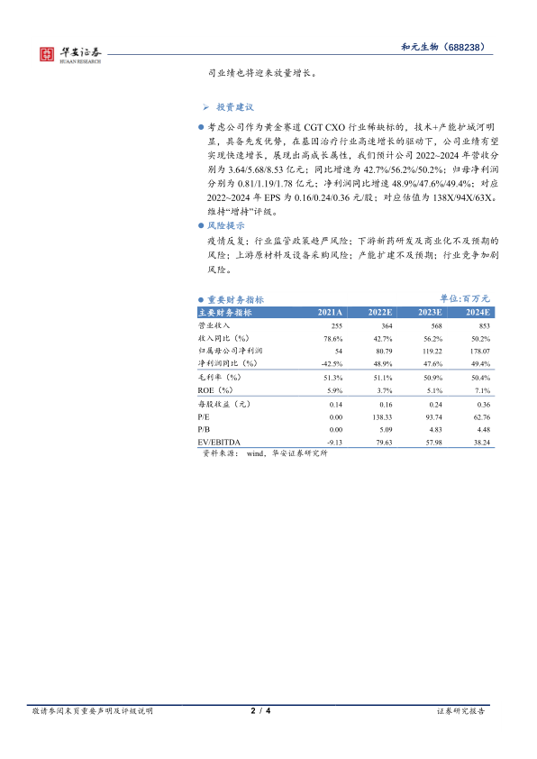 华安证券维持和元生物“增持”评级。鉴于公司作为CGT CXO行业稀缺标的,具备明显的技术和产能护城河及先发优势,在基因治疗行业高速增长驱动下,公司业绩有望实现快速增长。 预计公司2022-2024年营收分别为3.64亿元、5.68亿元、8.53亿元,同比增速分别为42.7%、56.2%、50.2%。 归母净利润分别为0.81亿元、1.19亿元、1.78亿元,净利润同比增速分别为48.9%、47.6%、49.4%。 对应2022-2024年EPS分别为0.16元/股、0.24元/股、0.36元/股。 对应估值分别为138X、94X、63X。