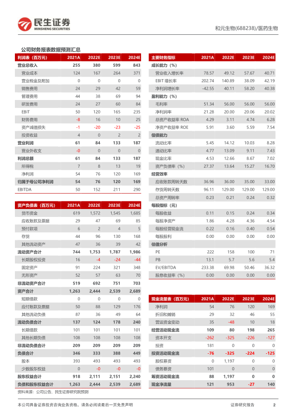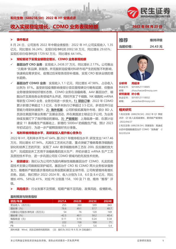 本报告对和元生物(688238.SH)2022年上半年的业绩进行了分析,核心观点如下: