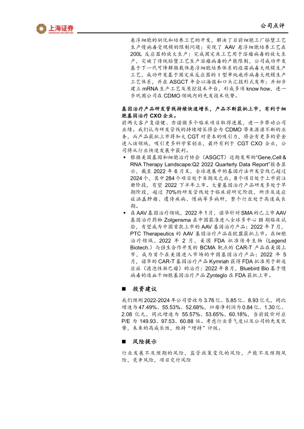 前两大客户复诺健、亦诺微多个临床项目取得进展,进一步带动公司业绩。 我们认为研发管线的持续增长将会为 CDMO 带来源源不断的业务,而产品获批上市将加大 CGT 对资本的吸引力,将会有更多的资金进入该领域,吸引更多科学家创业, 最终有利于 CGT CXO 企业,公司将从行业快速发展中获利。