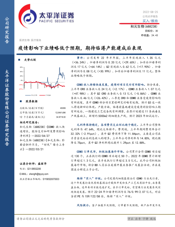 2022年上半年,和元生物实现营业收入1.35亿元,同比增长36.24%;归母净利润0.20亿元,同比增长29.65%;扣非后归母净利润0.17亿元,同比增长64.14%。第二季度,公司实现收入0.62亿元,同比增长17.90%;归母净利润0.08亿元,同比增长30.99%;扣非后归母净利润0.11亿元。整体业绩表现略低于市场预期。疫情对公司业务造成一定影响,第二季度CRO和CDMO业务增速均有所放缓,其中CDMO部分项目里程碑交付出现延期,预计相关收入将在第三季度逐步回补。此外,临港前基地建设也因疫情封控导致工期延后。