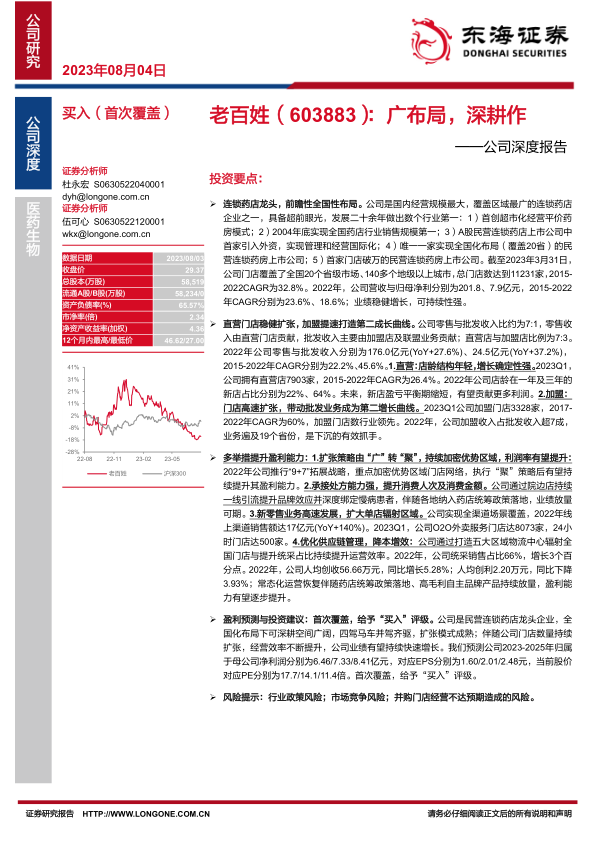 盈利预测与投资建议:首次覆盖,给予“买入”评级。公司是民营连锁药店龙头企业,全国化布局下可深耕空间广阔,四驾马车并驾齐驱,扩张模式成熟;伴随公司门店数量持续扩张,经营效率不断提升,公司业绩有望持续快速增长。我们预测公司2023-2025年归属于母公司净利润分别为6.46/7.33/8.41亿元,对应EPS分别为1.60/2.01/2.48元,当前股价对应PE分别为17.7/14.1/11.4倍。首次覆盖,给予“买入”评级。