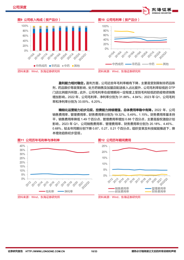 多举措提升盈利能力:1.扩张策略由“广”转“聚”,持续加密优势区域,利润率有望提升:2022年公司推行“9+7”拓展战略,重点加密优势区域门店网络,执行“聚”策略后有望持续提升其盈利能力。2.承接处方能力强,提升消费人次及消费金额。公司通过院边店持续一线引流提升品牌效应并深度绑定慢病患者,伴随各地纳入药店统筹政策落地,业绩放量可期。3.新零售业务高速发展,扩大单店辐射区域。公司实现全渠道场景覆盖,2022年线上渠道销售额达17亿元(YoY+140%)。2023Q1,公司O2O外卖服务门店达8073家,24小时门店达500家。4.优化供应链管理,降本增效:公司通过打造五大区域物流中心辐射全国门店与提升统采占比持续提升运营效率。2022年,公司统采销售占比66%,增长3个百分点。2022年,公司人均创收56.66万元,同比增长5.28%;人均创利2.20万元,同比下降3.93%;常态化运营恢复伴随药店统筹政策落地、高毛利自主品牌产品持续放量,盈利能力有望逐步提升。